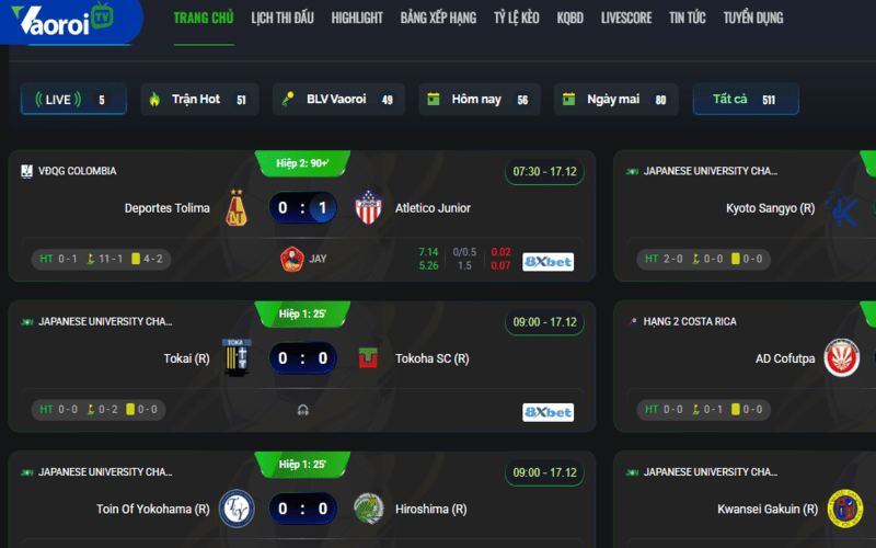 Ngay trên trang chủ, bạn sẽ thấy một danh sách các trận đấu đang và sắp diễn ra trong ngày, được sắp xếp theo thời gian. Các trận đấu nổi bật thường được ghim ở vị trí dễ thấy. Bạn có thể: