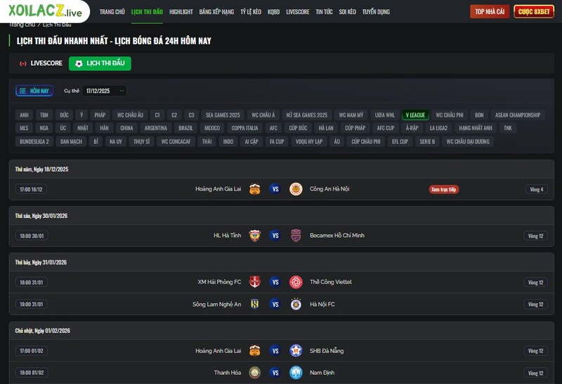 Điểm cộng lớn là Xoilacz TV vẫn cập nhật lịch thi đấu V-League 2. Anh em nào theo dõi các đội trẻ, đội tỉnh chắc sẽ hiểu cảm giác nhiều web “lơ đẹp” giải này.